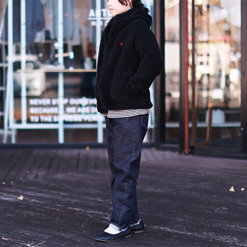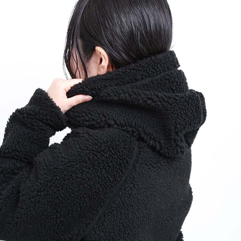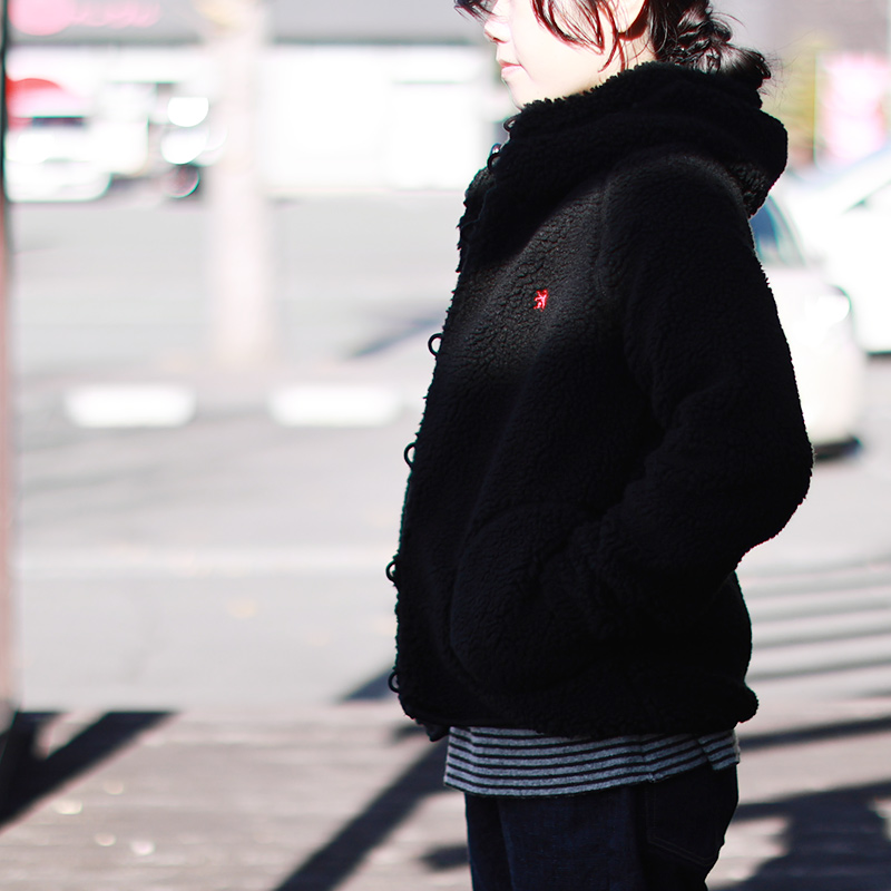 印象的なフロントの丸いクルミボタンは、トップまで閉めることで首周りまで暖かく、フードの量感が際立つ立体的なシルエットも楽しめるデザイン。