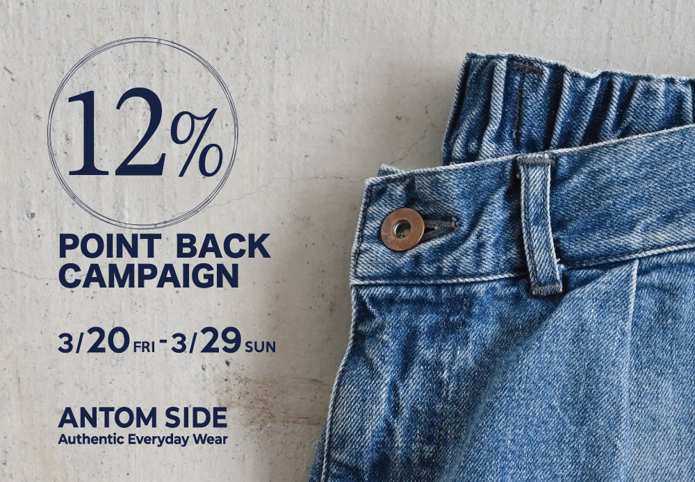 3/20(金:祝)〜3/29(日)の期間、ANTOM SIDE全店舗にて12%ポイントバックフェアを開催します。